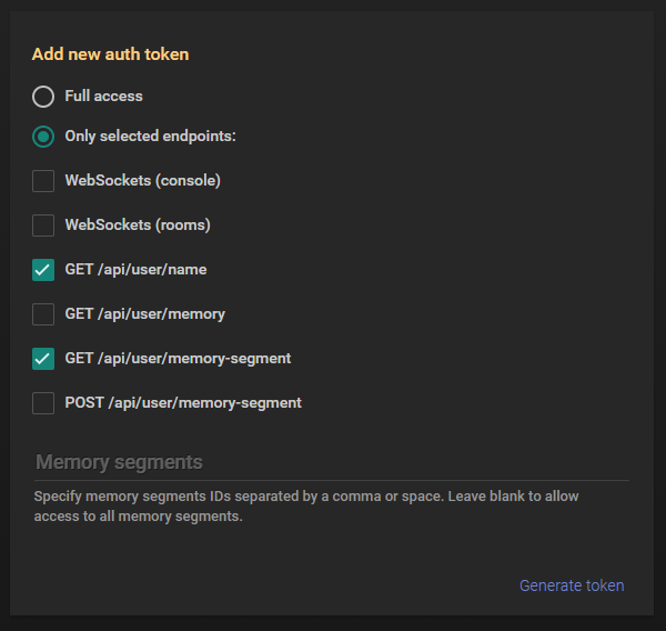 전체 권한(full access) 토큰은 일반 로그인 자격 증명과 동일한 범위의 접근 권한을 가집니다. 또한 접근 범위를 선택한 엔드포인트, 웹소켓 이벤트, 메모리 세그먼트로 제한할 수도 있습니다.