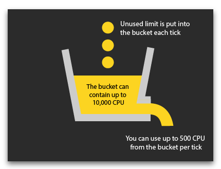 어떤 틱에서 스크립트가 계정에 설정된 CPU 기준(baseline) 제한보다 적게 CPU를 사용하면, 그 차이가 누적 버킷에 더해집니다. 최대 10,000 CPU까지 누적할 수 있습니다. 버킷에 누적분이 있다면, 한 틱에서 버킷에 쌓인 양 중 최대 500 CPU까지 사용해 CPU 제한을 초과할 수 있습니다.