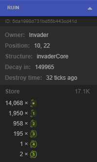 에너지를 채굴하는 모든 룸에는 내부 카운터가 있으며, 대략 채굴된 에너지 100,000 단위(그리고 약간의 랜덤 변수)가 누적되면 카운터가 만료됩니다. 카운터가 만료되면, 게임이 제어하는 새로운 크립이 룸 출구 중 하나에서 등장해 여러분의 크립을 사냥합니다. 대부분의 경우 구조물은 건드리지 않지만, 구조물이 이동 경로에 있으면 파괴하려고 할 것입니다. 이 크립은 attack, rangedAttack, dismantle을 사용할 수 있습니다. 룸 간 이동은 할 수 없습니다.