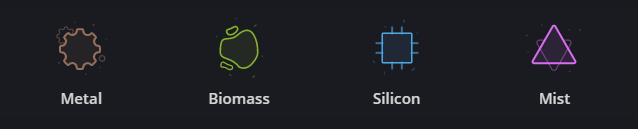 원자재 타입은 4가지입니다: Metal, Silicon, Biomass, Mist.