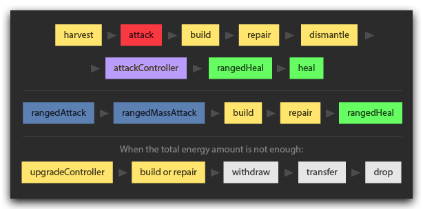 creep.harvest(source); // OK, but execution failed since it was blocked by build하지만 위 의존 관계에 포함되지 않은 메서드(또는 서로 다른 파이프라인의 메서드)들을 조합하면 한 틱 안에서 여러 메서드를 실행할 수 있습니다. 예를 들면: